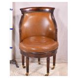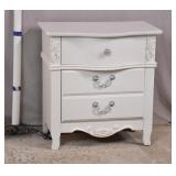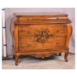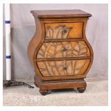 Bombe style 3 drawer end table with carved palm leaf front; 951-198 - faux ostrich leather top - (small chip in leaf) - 20x13x27