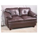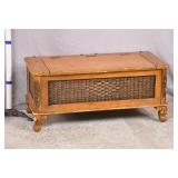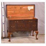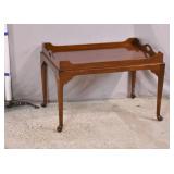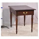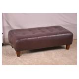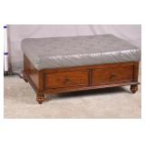Bassett cherry 2 drawer cocktail ottoman with gray leather tufted top; 662-1703 - turned legs - 44x30x20