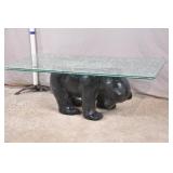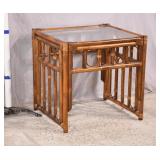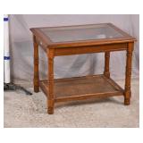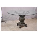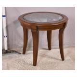 Round side table with glass top; 951-203 - distressed iron pieces under glass - 28x28x24