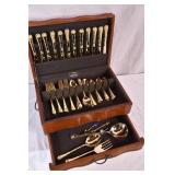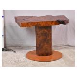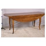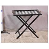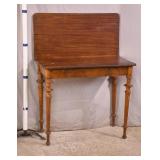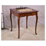 Cherry game table with 2 drawers; 951-202 - serpentine edge of top - reversible chess/checker and backgammon boards - includes chess and checker pieces (broken cross on king) - 28x28x31