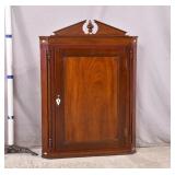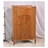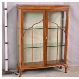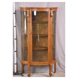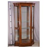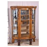 Single door curio cabinet with reeded columns; 951-lot - beveled glass door - lighted interior with mirror back and adjustable glass shelves - serpentine sides - (missing 3 of 4 glass panes on sides; crack in molding) - 43x15x80.5