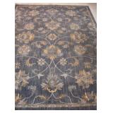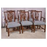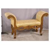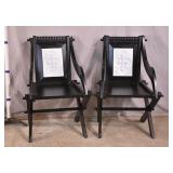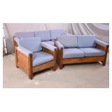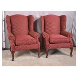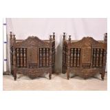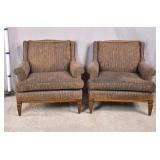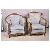 Pair of carved frame chairs with blue fabric; 944-103,104 - His and hers - (finish and fabric as-is) - 36x36.5x34.5 and 34.5x37x37.5