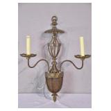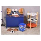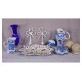 Group of misc blue and white decorative items; 951-lot - blue glass vase, pitchers, ball, dresser box with lid, tray, - pr of wire candle sconces, pr of finials (chips) - 951-126,134,138,145,148,132,160,165