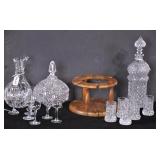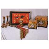 Group of misc decorative items; 951-150,108, 146,135,110 - serving tray with birds 24x16x2.5 - pair of candlesticks, large tassel, black and gold piece, large and small woven containers