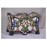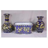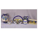 Group of 6 blue,white and yellow ceramic pieces; 951-139,133,125,154,123161 - floral designs - large vase, basket with handle (crack), vase, planter, etc. - 11x9.5x14.5 large vase