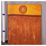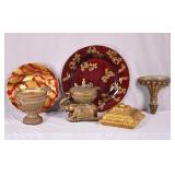 Group of 6 decorative red and gold pieces; 951-lot - 19" platter, 14" bowl, vase, elephant container, wall shelf, container with lid - 951-124,159,158,153,156