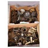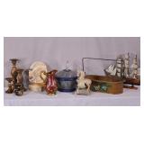 Group of misc decorative pieces; 951-lot - 3 candle stands, small black urn, red floral pitcher - stone fish, trojan horse, blue and silver container with lid - wooden basket, model Mayflower ship - 951-131,136,147,149,151,152,213