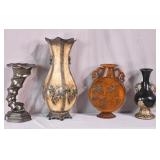 Group of 4 large vases; 951-103,106,122,164 - silver twisted, metal with grapevine, metal with elephants, black and silver faux marble - 10x10x24 largest size