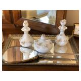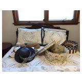 Expect to find, retro lamps, vintage side tables with latticed drawers, a great taupe leather couch and chair set, vintage luggage, clothing, and Christmas and other holiday decor, a delightful set of bright coffee mugs and tea cups and dishes, awesome kitchenware like pots, pans, casserole dishes, blue smokey glasses, a beautiful set of china, dark-wood dining table and chairs, wonderful decor like pottery and glass vases, ceramics, and candlestick holders, vintage clothing and accessories like watches, purses, and hats, antique hand mirror, wood and brass dresser with mirror, clothing racks, grand china cabinet, an armoire, buffet, plus boardgames, puzzles, electronics, games, a Squier Stratocaster and Fender speaker, and more! |
