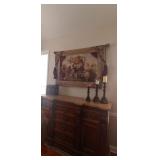 Hickory White Dining Room Set, Bedroom Furniture, tapestries, large oil paintings, area rugs, Raymour Flanigan Round Pedestal table with leaf and 4 Chairs, white hutch, Settee, albums, knock knacks, chaise, over,sized wing,chairs, side table, entry wine table, tufted leather ottoman/coffee table, lamps, CDs,DVDs, 2 vintage bicycles, and more.... |