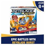 COMPETITIVE BATTLING TOPS: Compete to be the last top spinning with Beyblade Burst tops! Each player loads their top onto their launcher and pulls the ripcord over the Beyblade Burst Beystadium for epic head-to-head battles EVERYTHING NEEDED TO BATTLE: Includes 1 Beyblade Burst Beystadium, 2 right-spin Beyblade Burst battling tops, and 2 right-spin launchers