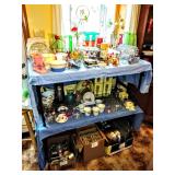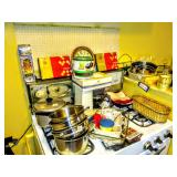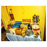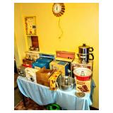 Pyrex Mugs, Disney Pepsi Glasses, Welches Looney Tunes Glasses, Pennsylvania Dutch Cookware, German Trivets, Vintage Corning ware In Original Box, Pyrex Range top Percolator In Original Box, Kromex Serving Dishes in Original Boxes, Vintage and Modern Hand Mixers In Original Boxes, Mirro Cookie Press In original Box, Horizon Stainless Cookware NIB, Marina Wok NIB, Vintage Mr Coffee In Original Box, Vintage Imperial By Regal Stainless Cookware In Original Box, 2 Vintage Costco Metal Kitchen Carts, Waffle Irons, Club Aluminum Cookware, Enamelware Cookware From Poland, Corelle Dish Set, Bakelite Cutlery, Glass Pyrex Pots with Steel Bands, Baking Ware, Canning Items,