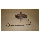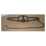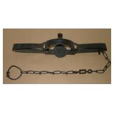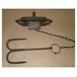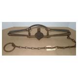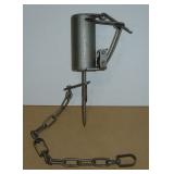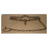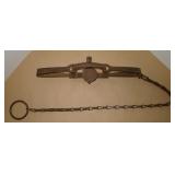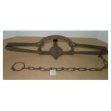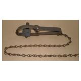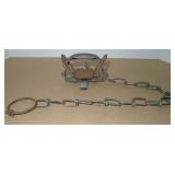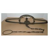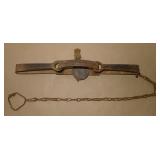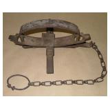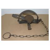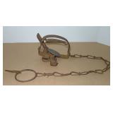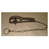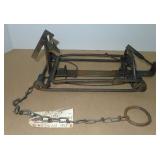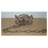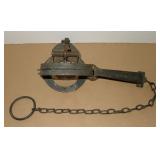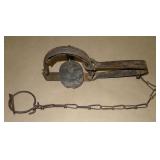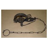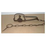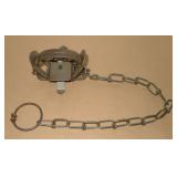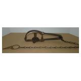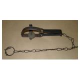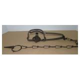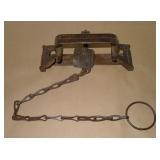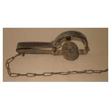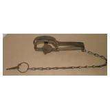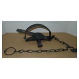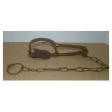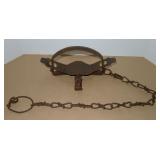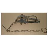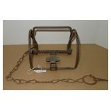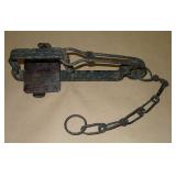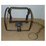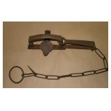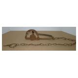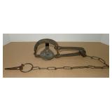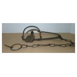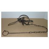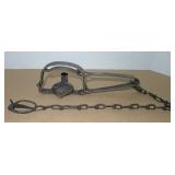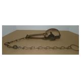 Vintage Animal Trap. Measures approx. 12" in length with long link chain. Pan is not readable. Please see additional pictures for detail. Condition: Good for age |