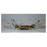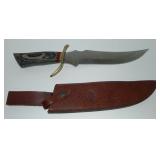 Bowie Knife. Frost Cutlery Bone Collector USA - Item #BC-798. Measures 10" overall. Handle Material: Bone (Brown Bone). Features: Brass Guard, Brass Pommel, Brass Spacers, Etched Blade, Leather Sheath, Stainless Steel Blade and Wood Spacers. Currently Out of Stock online. Retail Value: $39.95 Condition: Very Good |