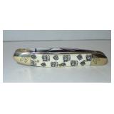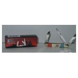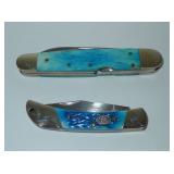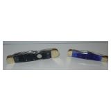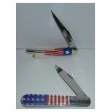 Pocket Knives. Master Barlow Red, White, and Blue USA American Flag Pocket Knife and a Schrade Walden 65th Anniversary Folding Knife featuring nickel silver bolsters and brass pins and liners. Overall length on both are 5". Condition: Very Good |