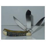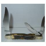 Pocket Knife. German Bull Pocket Knife with Hand Made Deer Stag Handle - Folding Hunter with 3 German Stainless Blades. Measures 5" overall. Condition: Very Good |