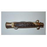 Pocket Knife. Hen and Rooster Stag Stiletto Knife. Item #HR-5081DS/D measures 5" overall. Features: Damascus Blade, Decorative Blade, Decorative Handle and Speed Safe Action. Currently Out of Stock online. Retail Value: $149.33 Condition: Very Good |