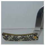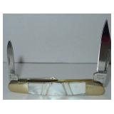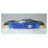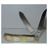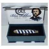 Pocket Knife. Colt Blue Ribbon Trapper Folding Knife - Item# CT563 measures 4" overall. Clip and spey blades. Knives have 440A stainless blade(s) with frosted etching. Genuine mother of pearl and blue synthetic striped handles with grooved, pinched and embossed nickel silver bolsters. Nickel silver spacer stripes with original box. Condition: Very Good |