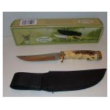 Hunting Knife. Bone Collector 8.5" Gut Hook Skinner - #BC 795. Authentic Bone Handle, Stainless Steel Blade Hunting Knife with Leather Sheath. 4" 440 stainless steel polished blade 4.5" authentic bone handle Condition: Very Good |