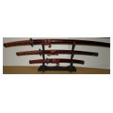 Swords. Set of three Swords with Display Rack. Measuring 21" to 39" Long. Blades are marked "China". One Sheath has minor damage as shown. Condition: Very Good |