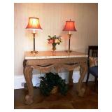 - Maitland Smith French-style carved Console table with Greek key border, shell and swag detail, curved legs & tessellated stone top