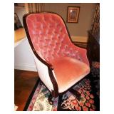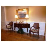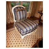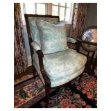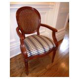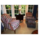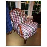 - Pair large French-style mahogany armchairs with plaid upholstery