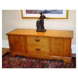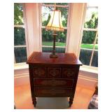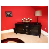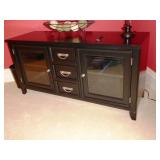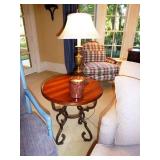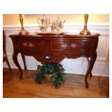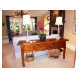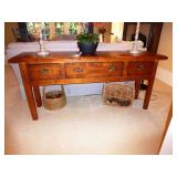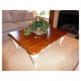 - Century cherry console table with 3 drawers, coordinating coffee table with antiqued white base & bronzed iron side table – all with cherry planked tops