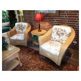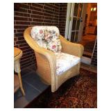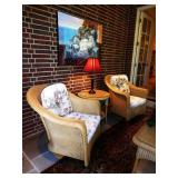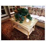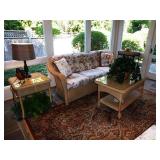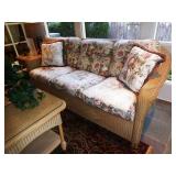 - Lloyd Flanders natural wicker grouping – sofa & pair swivel rockers with floral cushions, 2 side tables & 2-tier coffee table (all with protective glass tops)