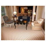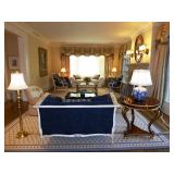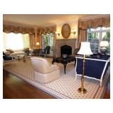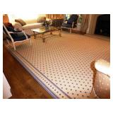 - 2 custom blue/off white/gold room size carpets with borders - 21’x11’6” (Living rm) & 14’x12’ (Dining rm)