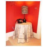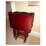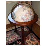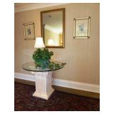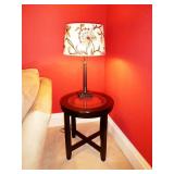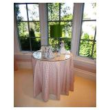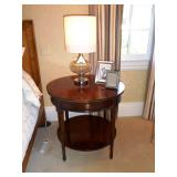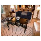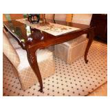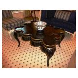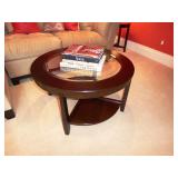 - Round 2-tier mahogany coffee table with inset glass top, 2 self storing benches and matching side table