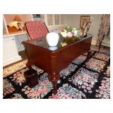 - Sligh carved mahogany desk with 3 part inset leather top from the “Ellis” Collection