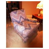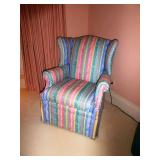 - Mitchell Gold multi color skirted wingback chair in custom pastel stripe