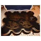 - Decorative Crafts black lacquer Chinese Chinoiserie coffee table with scalloped top & gilded detail