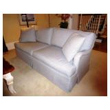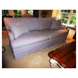 - Pair Pearson pale blue/beige herringbone skirted sofas