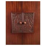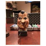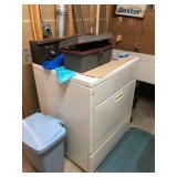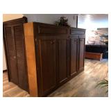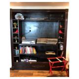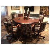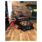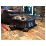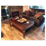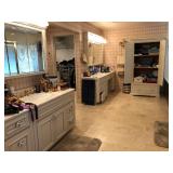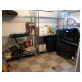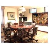 Basement Beautiful Suite of Nailhead Leather Seating, including Sofa, Loveseat, Armchair and Unique Turtle Ottoman, Tole Style Tray Table, Carved Wood Coffee Table, Custom Poker Table that Converts into Billiard Table with Chairs, Asian Buffet Cabinet, Antique Oak Wall Storage, Richard Nixon Bust, Poker Chip Sets, Pewter, Juicer Machine, MREs, Metal Storage Shelving, Whirlpool Optima Washer, Kenmore Dryer, Suitcases, and more.