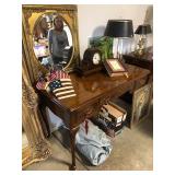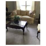 Pristine furnishings by Thomasville and Henredon, rugs, decor and more! dining set by Thomasville Henredon sofa arm chairs coffee table dishes lamps copy machine dresser mirrors 4 post bed side tables carved armoire with mirrored front large area rug Weber grill vintage and antique furniture extension ladders black footstools hutch electric lawn mower plants mirrors artwork
