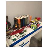 Items include:poker table, chess set, Marantz & Yamaha receiver, round table/chairs, fishing rods, bar signs, paintings/art, antique GE fridge, GE freezer, DVDs, desks, office chairs, lighting fixtures, couches, coffee/side tables, rugs, wall clocks, kitchen table/chairs, speakers, dishing hutch, glassware/Lenox, flute, charbroil barbecue, Harry Potter books, white/blue dresser, desk, side table, children’s toys, Hess trucks, twin bedroom set, clothes/bags, sleeping bags, framed prints, bikes, bedroom set, outdoor planters and more,..... |