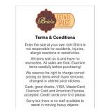 Enter the sale at your own risk! Brie’s is not responsible for accidents, injuries, allergic reactions or sensitivities. All items sold as is and have no warranties. All sales are final. Examine items carefully before purchasing! We reserve the right to charge correct pricing on items which have removed, changed or altered price stickers. Cash, VISA, MasterCard, Discover Card and American Express accepted on Thursday and Friday. Credit cards over $10 please. We will expect customers to line up in an orderly fashion. We do limit the number of customers who can enter the home at one time to start but do our best to expedite this process.