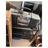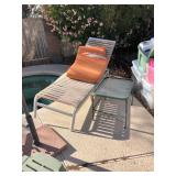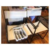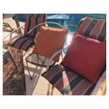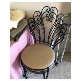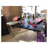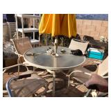 Small black top table with grey metal screw on legs, four metal back chairs with black faux leather seats