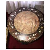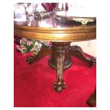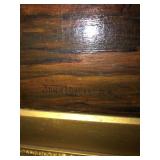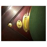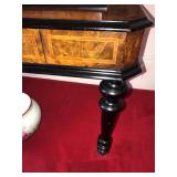 Phylphonic Zither Music Box-Table w/Four Cylinders; burled wood veneer with inlaid mahogany striping. Top decorated with insets of mother of pearl, cup turned legs. In working condition. Circa 1850