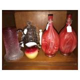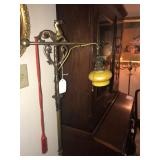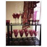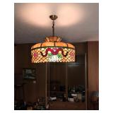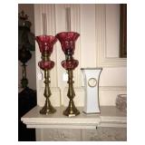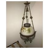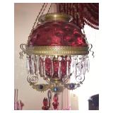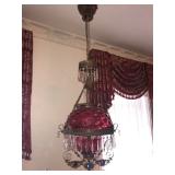 Cranberry Glass Hanging Oil Chandelier (electric conversion), having three sapphire blue glass jewels in the center frame.