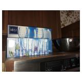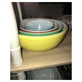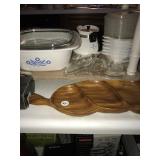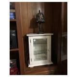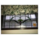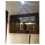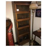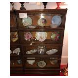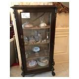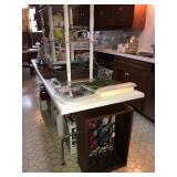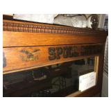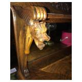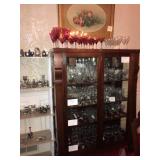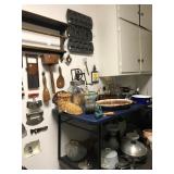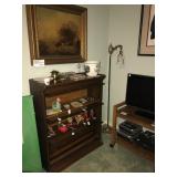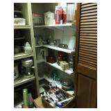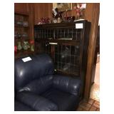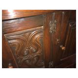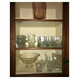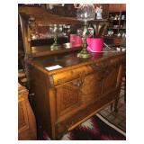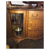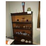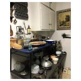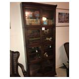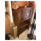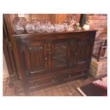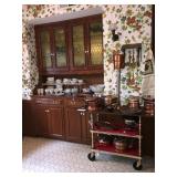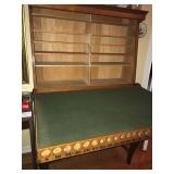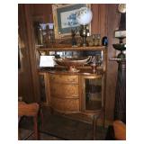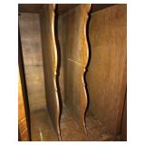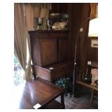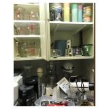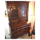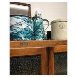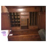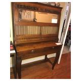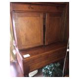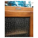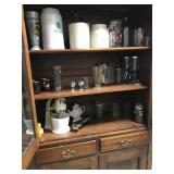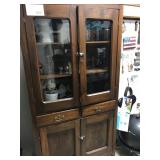 Antique Kitchen Cupboard with tin rack shelves, flour bin and sifter, glass front doors.