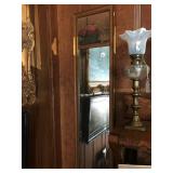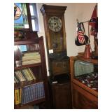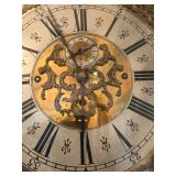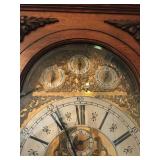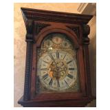 Tall Case Clock, Oak with carved case, long brass weight-driven: chimes quarter-hour, half hour and hour; Whittington and Westminster Chimes, solid brass around dial with ormolu details. Long, oval beveled glass window in door, with ornate carving; base with carving in relief of an old man. Circa 1800’s . This is a fabulous piece of art and stands 8’2” tall. Working Condition unknown and untested.