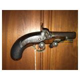 Gentleman’s, Black Powder, Percussion Cap Pistol, RS Clark with Damascus barrel, with platinum and yellow gold bands around barrel circa 1800’s. Very good condition.