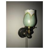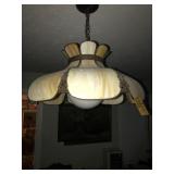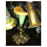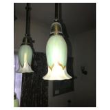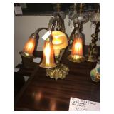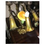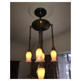 Quezal (Signed) Five- Shaded, Chandelier (fabulous arms), four shades are 7” high, each suspended on 20” long rods with hook ends and center shade 8” high on 25” long rod with hook end, w/Pair Matching Wall Sconces. Shades in the “King Tut” design. 43” overall length. Circa 1890-1920