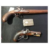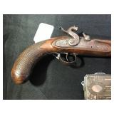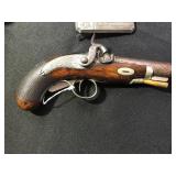 Black Powder, Percussion Cap Horse Pistol, Noran (reverse ‘r’). Our opinion is piston has been converted from flint lock to percussion cap. Again, our opinion. Significant and unique engravings on octagon shaped barrel. Appears to have gold leaf engraving which shows considerable wear, circa late 1700-early 1800’s. Very good condition.