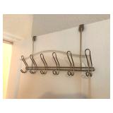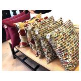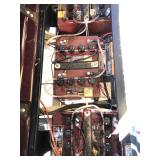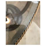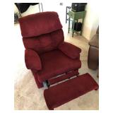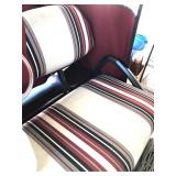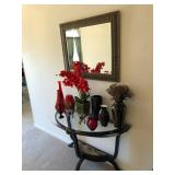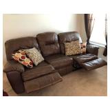#6 - Brown Faux-leather 3-seat Reclining Sofa w/attached cushions - $325 #7 - Merlot Corduroy Rocker Recliner - $95 #10 - Demi-Lune Bronze-finish metal Entry Table with glass top - $115