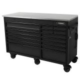 Husky Heavy-Duty 63 in. W 15-Drawer, Deep Tool Chest Mobile Workbench in Matte Black with Flip-Top Stainless Steel Top The Husky 63 in. W x 23 in. D 11-Drawer Mobile Workbench with Split Flip-Top Work Surface has arrived! The unique split flip-top work surface allows the user to lift open half of the work surface at a time, enabling projects to remain on the other half. Each flip-up section is supported to by a pair of gas struts making it easy to open and leave upright if desired. The work surfaces are covered with stainless steel for long-lasting durability. Underneath each section are storage bins that can be configured by the user for ultimate accessibility. The lower section of the workbench is configured with 15 drawers that glide on 120 lb. rated soft-closing ball-bearing slides. Each of the two larger bottom drawers has 2 sets of slides to accommodate larger and heavier items, and all drawers come with pre-cut premium embossed drawer liners. The large full-height drawer is a power tool charging station with an internal power strip and power tool hanging rack. On the outer right-hand side of the workbench you will find a second power strip with an additional 6 outlets and 2 USB ports as well as an ergonomic side handle and bottle opener. The entire unit comes with 6 pre-installed 5 in. x 2 in. casters that allow this unit to move around your workspace with ease. This item is NEW. Please come Preview! No Refunds After Item Has left the Building. Verify the condition of your Item before you leave, Thanks. MSRP: $ 998 (32) |