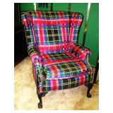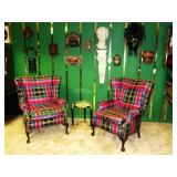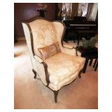 - Pair vintage Henredon ivory damask wingback chairs w/ mahogany frames