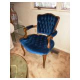 - Pair of Italian style tufted blue velvet mahogany arm chairs